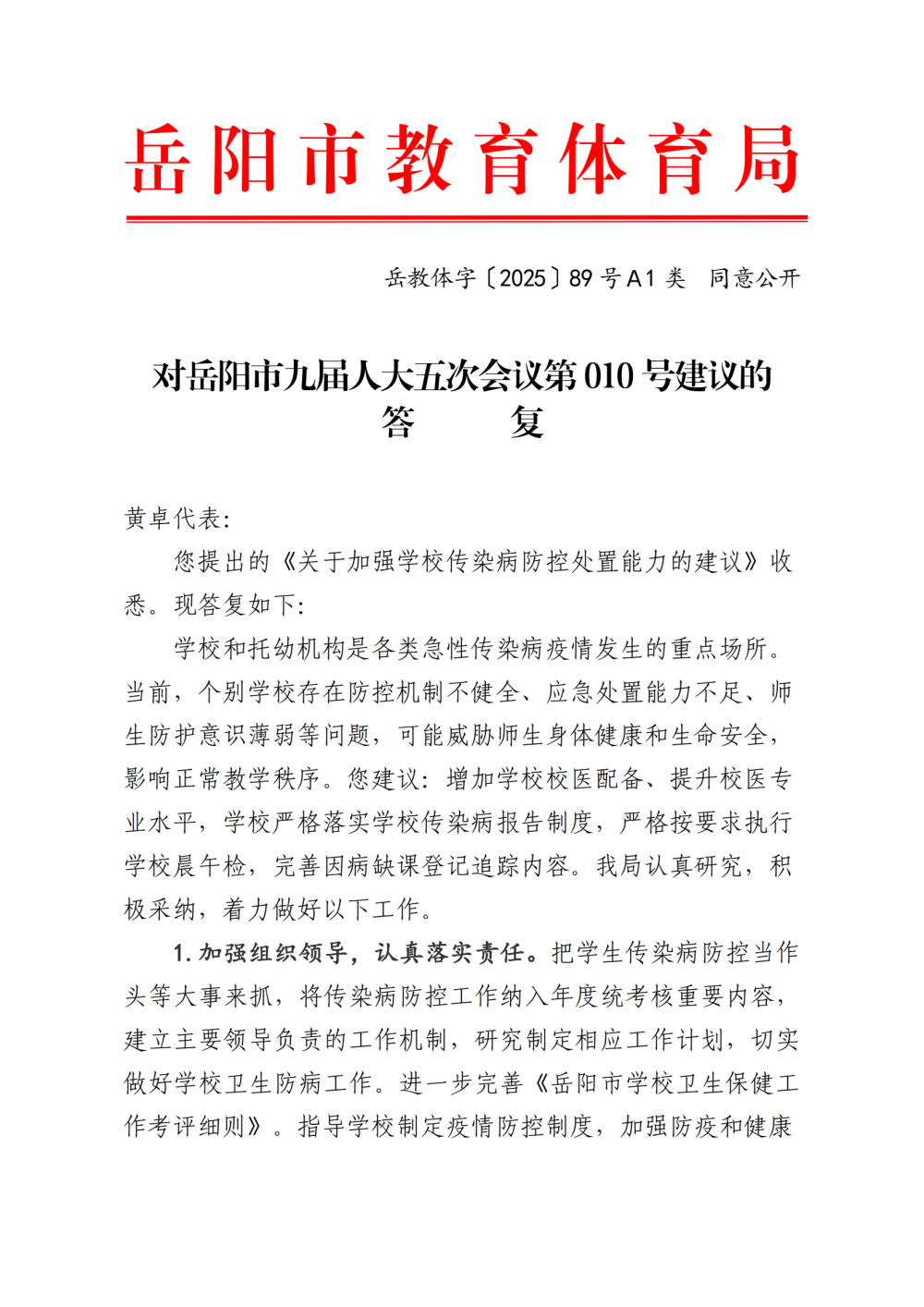 岳教体字〔2025〕89号对岳阳市九届人大五次会议第010号建议的答复