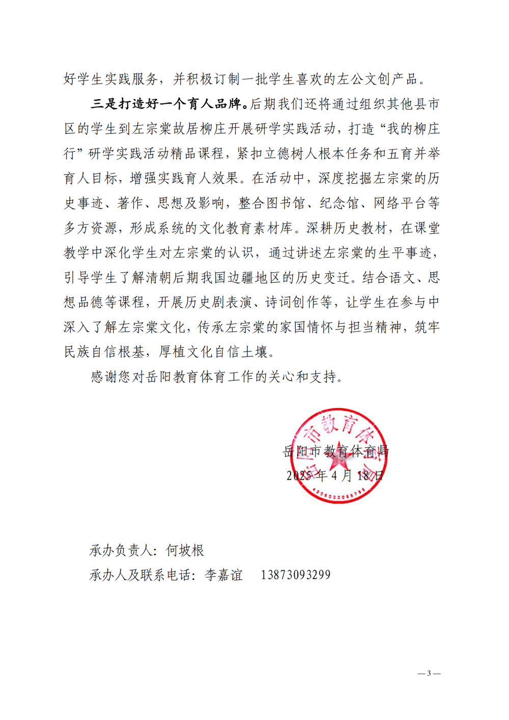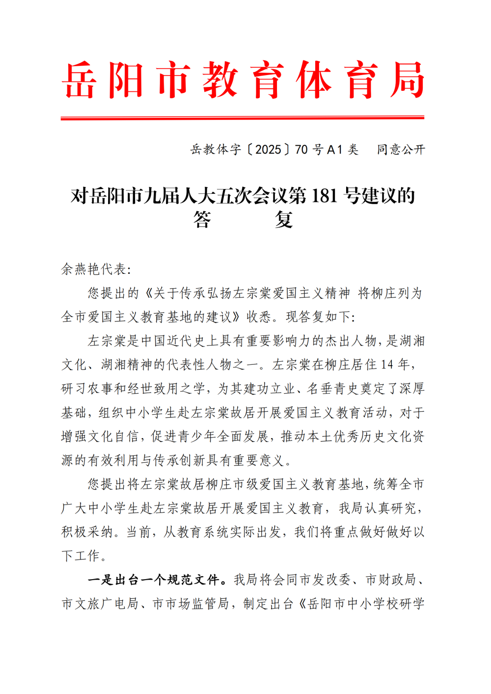 岳教体字〔2025〕70号对岳阳市九届人大五次会议第181号建议的答复