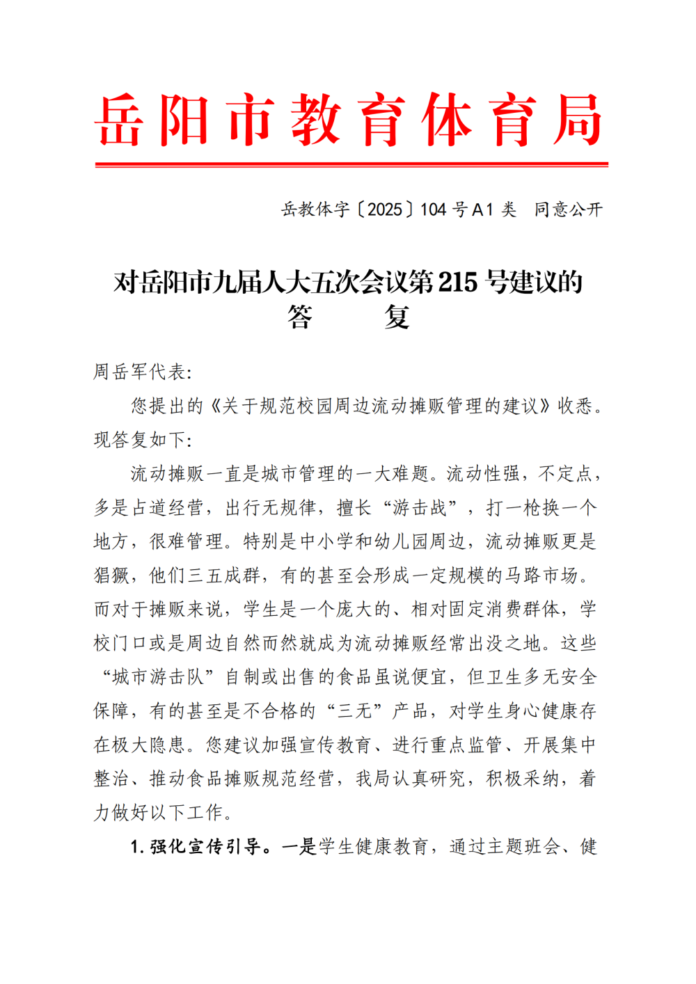 岳教体字〔2025〕104号对岳阳市九届人大五次会议第215号建议的答复