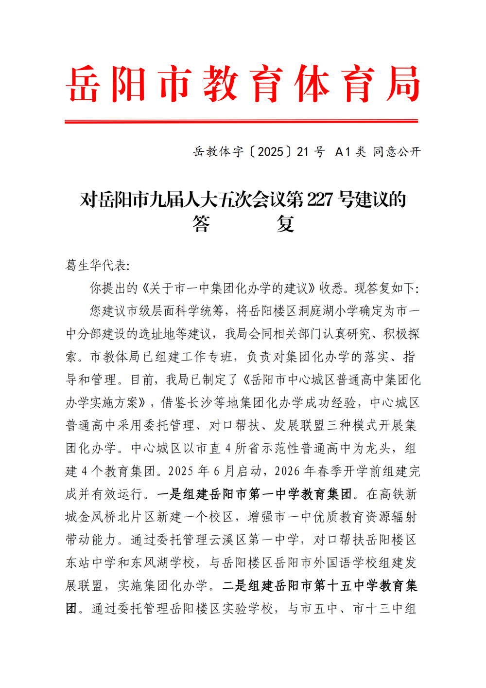 岳教体字〔2025〕21号对岳阳市九届人大五次会议第227号建议的答复