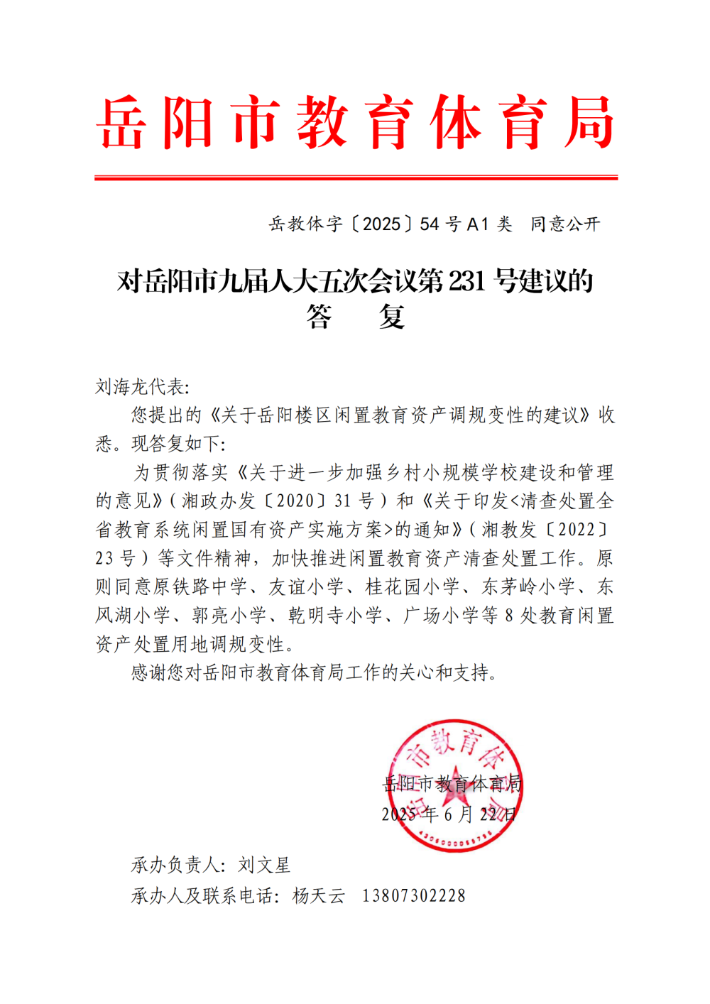 岳教体字〔2025〕54号对岳阳市九届人大五次会议第 231号建议的答复