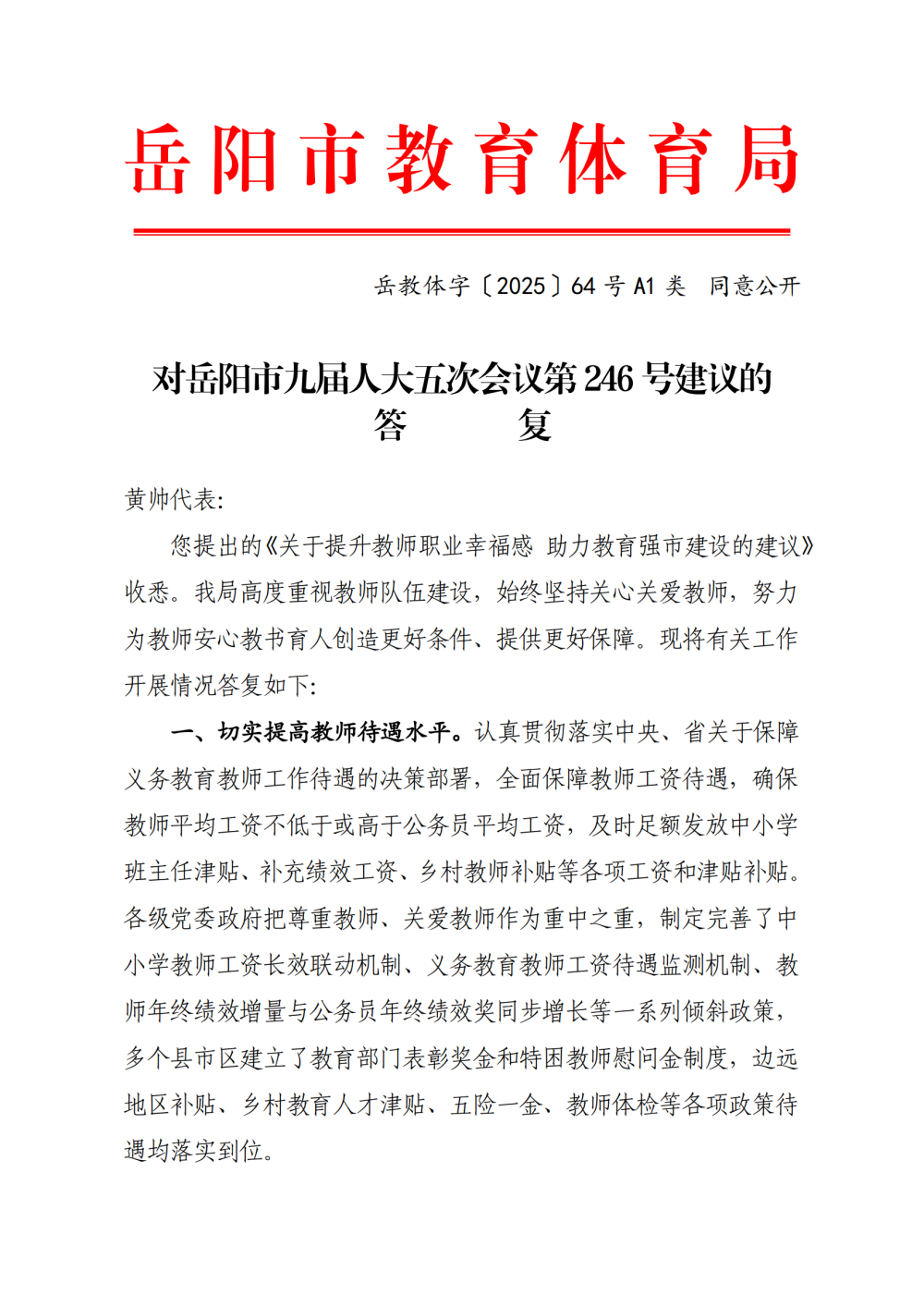 岳教体字〔2025〕64号对岳阳市九届人大五次会议第 246号建议的答复