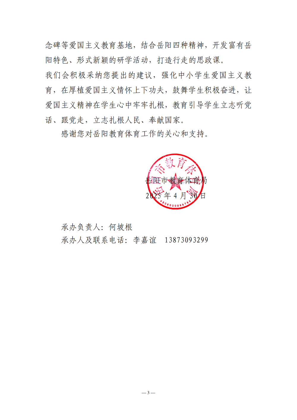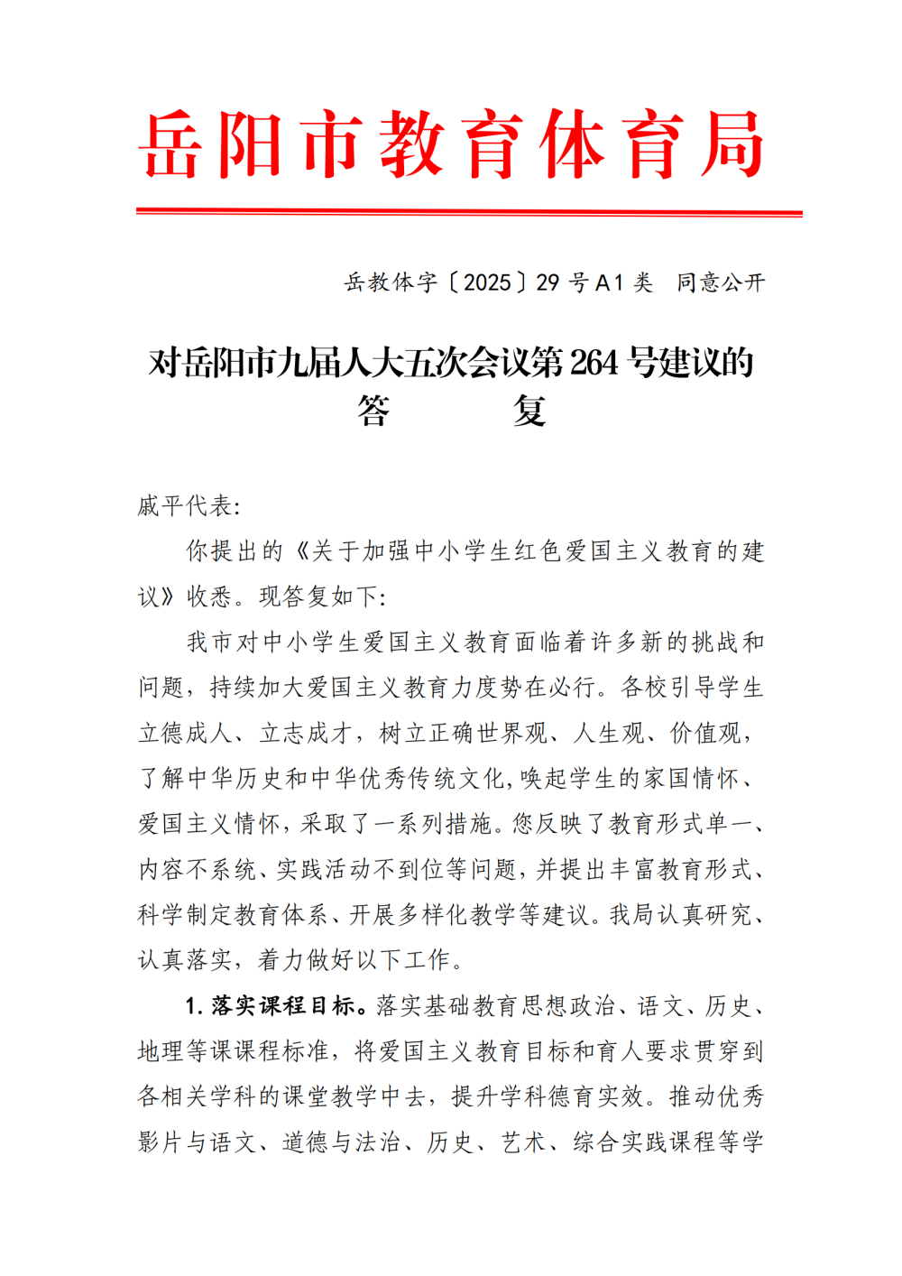 岳教体字〔2025〕29号对岳阳市九届人大五次会议第 264 号建议的答复