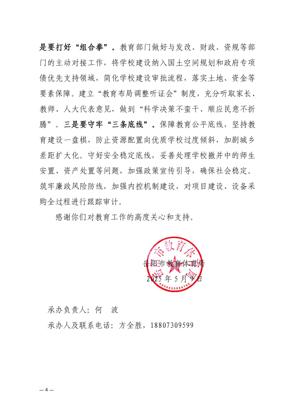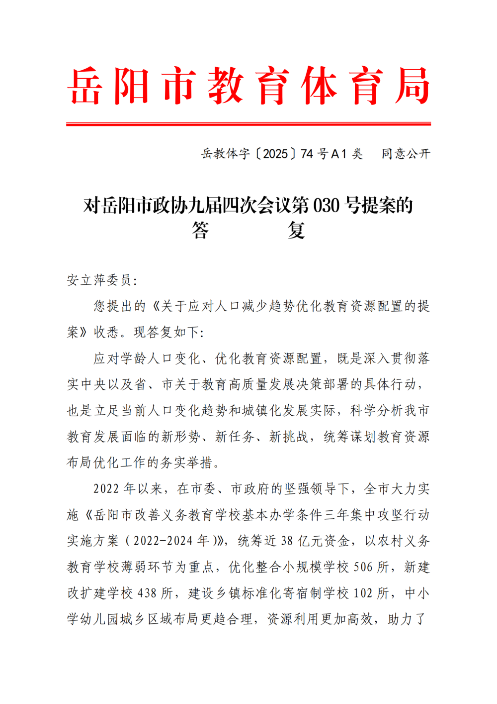 岳教体字〔2025〕74号对岳阳市政协九届四次会议第030号提案的答复