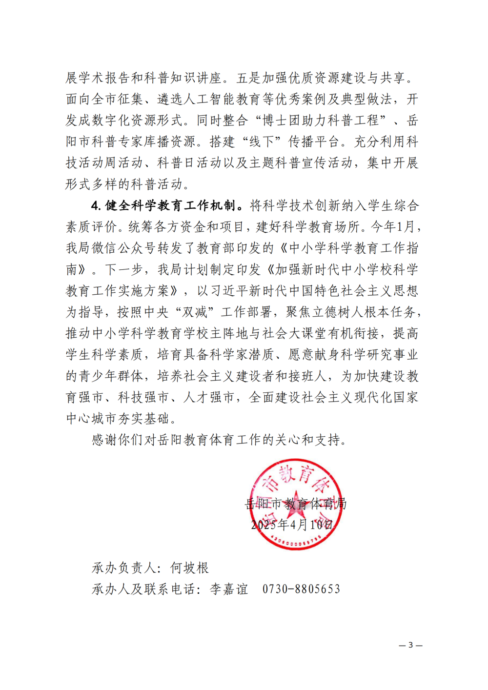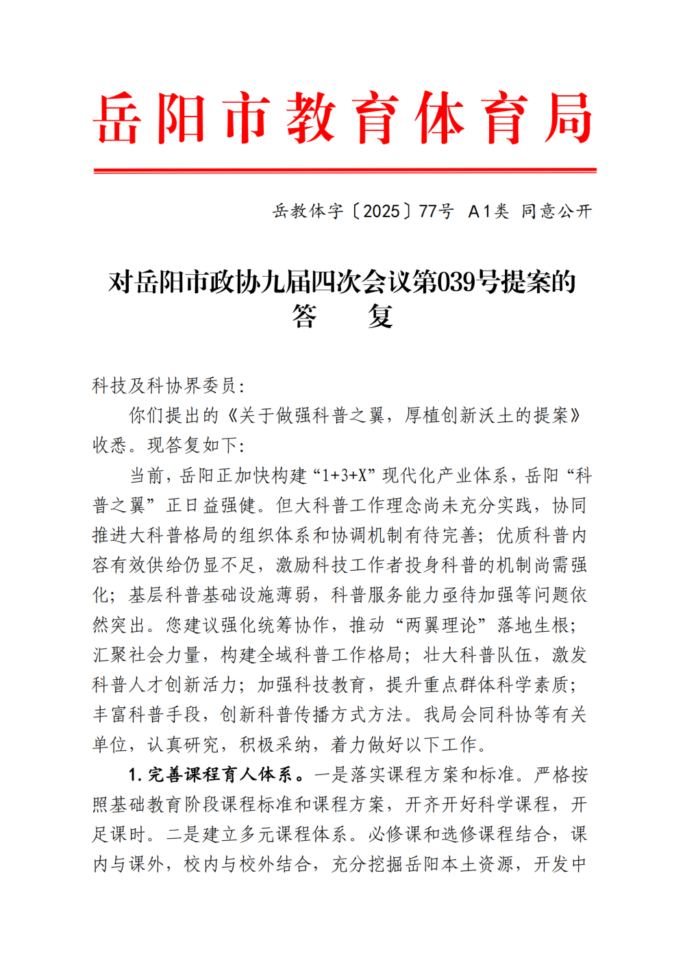 岳教体字〔2025〕77号对岳阳市政协九届四次会议第039号提案的答复
