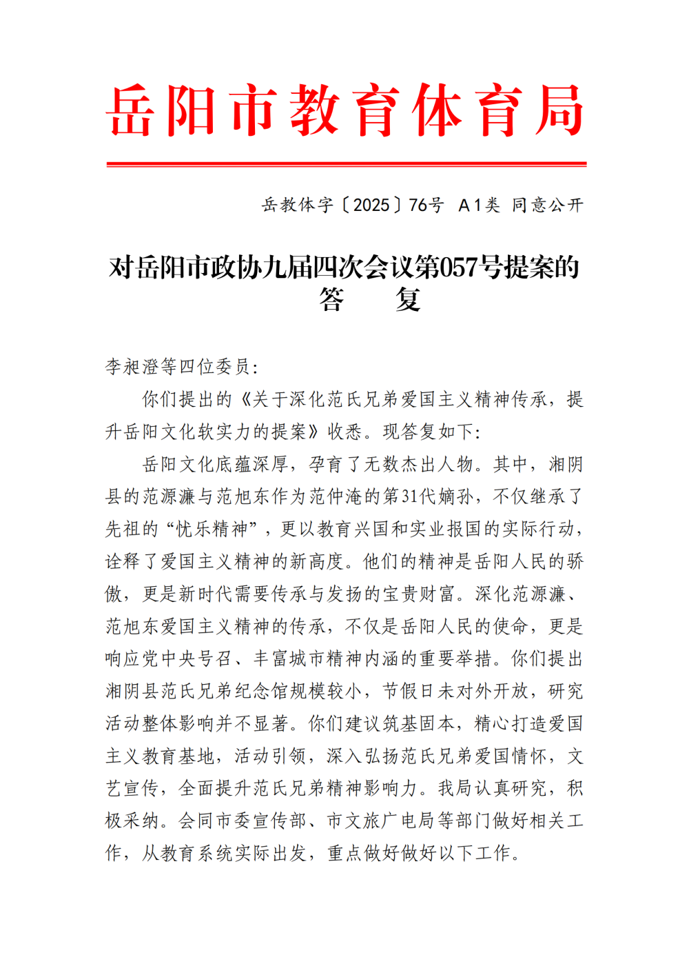 岳教体字〔2025〕76号对岳阳市政协九届四次会议第057号提案的答复