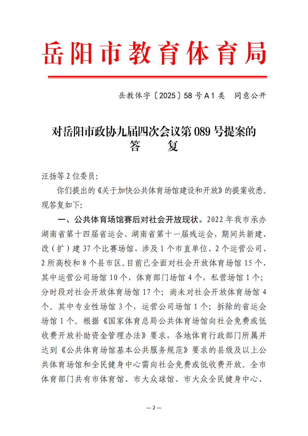 岳教体字〔2025〕58号对岳阳市政协九届四次会议第089号提案的答复