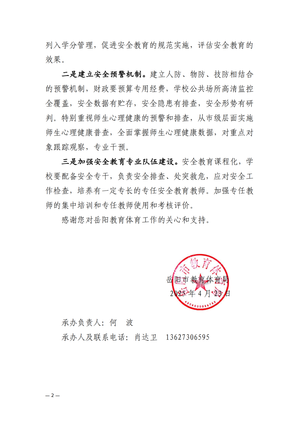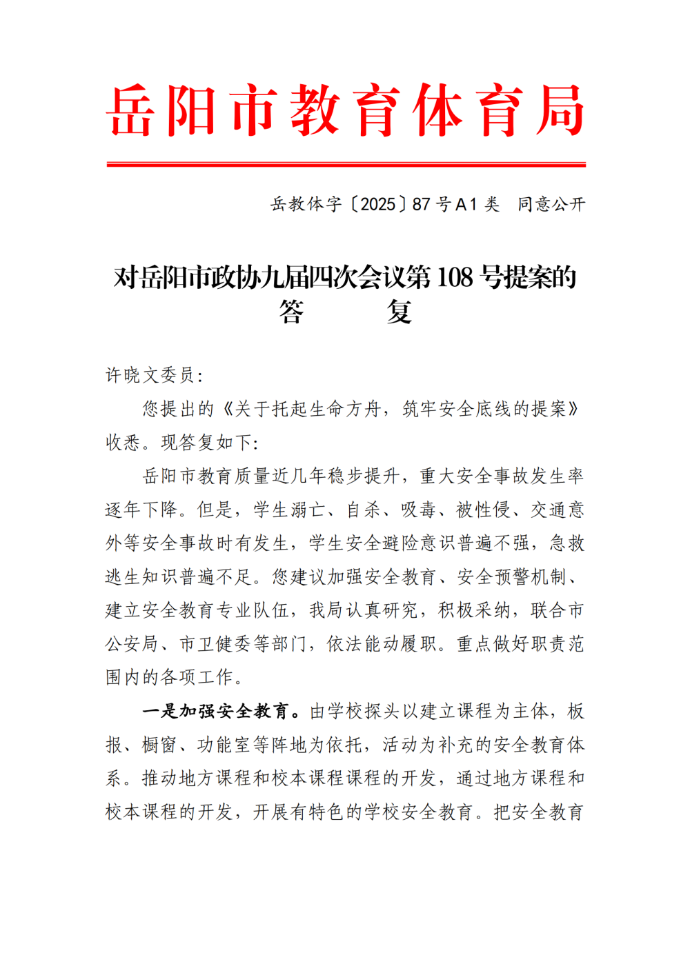 岳教体字〔2025〕87号对岳阳市政协九届四次会议第108号提案的答复