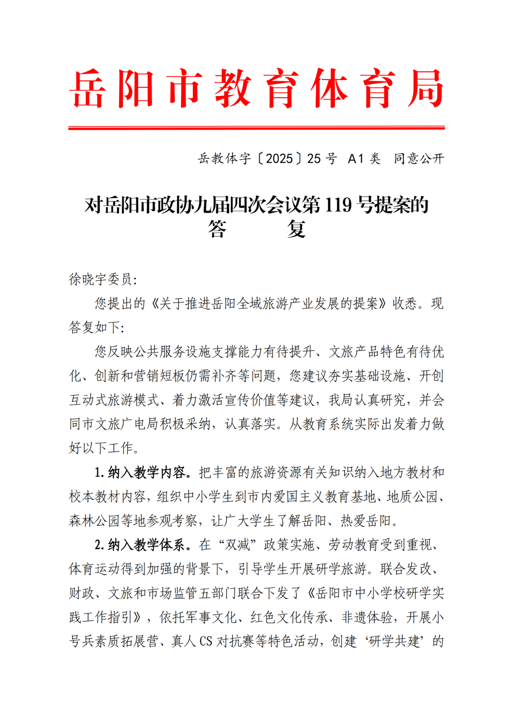 岳教体字〔2025〕25号对岳阳市政协九届四次会议第119号提案的答复
