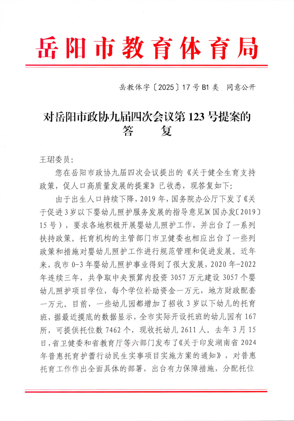 岳教体字〔2025〕17号对岳阳市政协九届四次会议第123号提案的答复