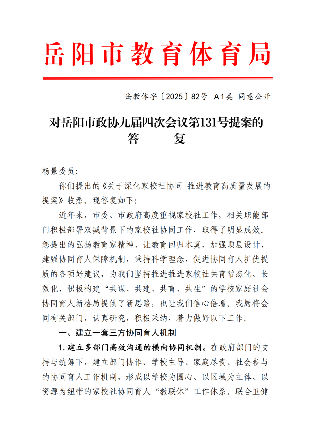 岳教体字〔2025〕82号对岳阳市政协九届四次会议第131号提案的答复