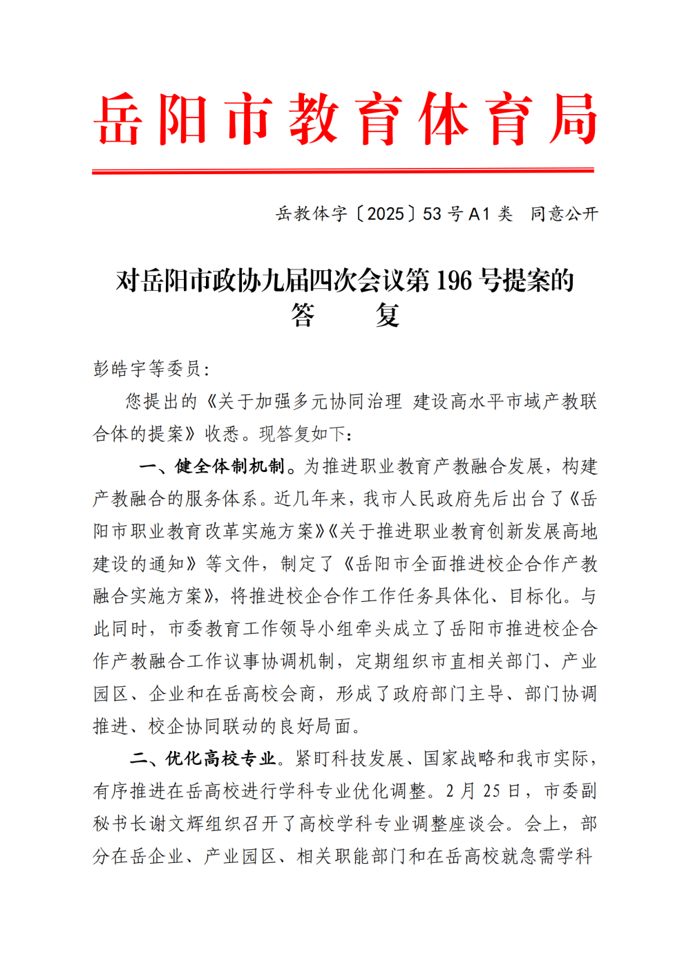 岳教体字〔2025〕53号对岳阳市政协九届四次会议第196号提案的答复