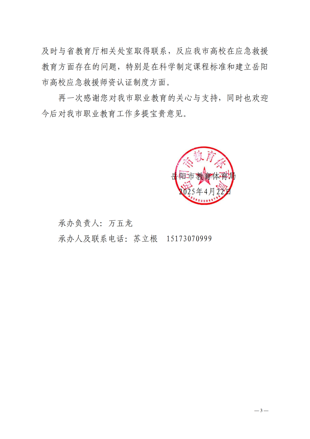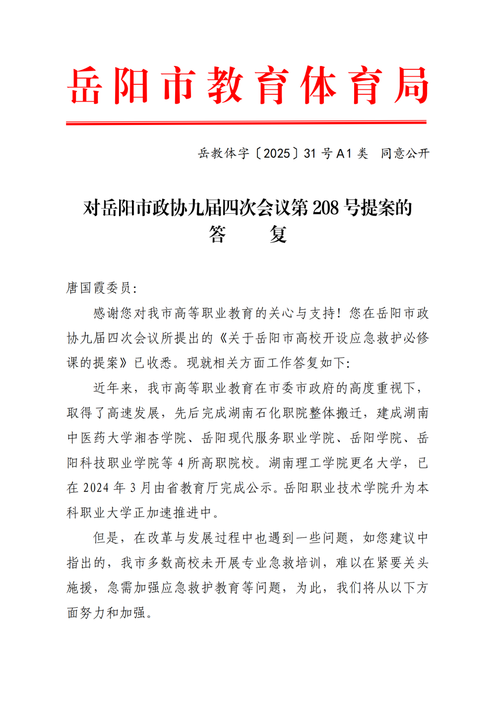 岳教体字〔2025〕31号对岳阳市政协九届四次会议第208号提案的答复