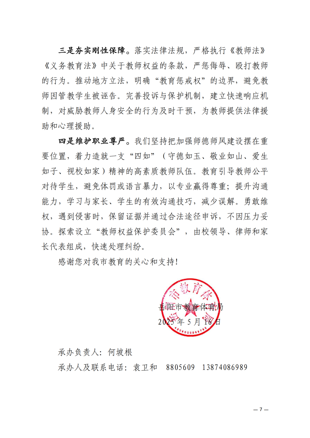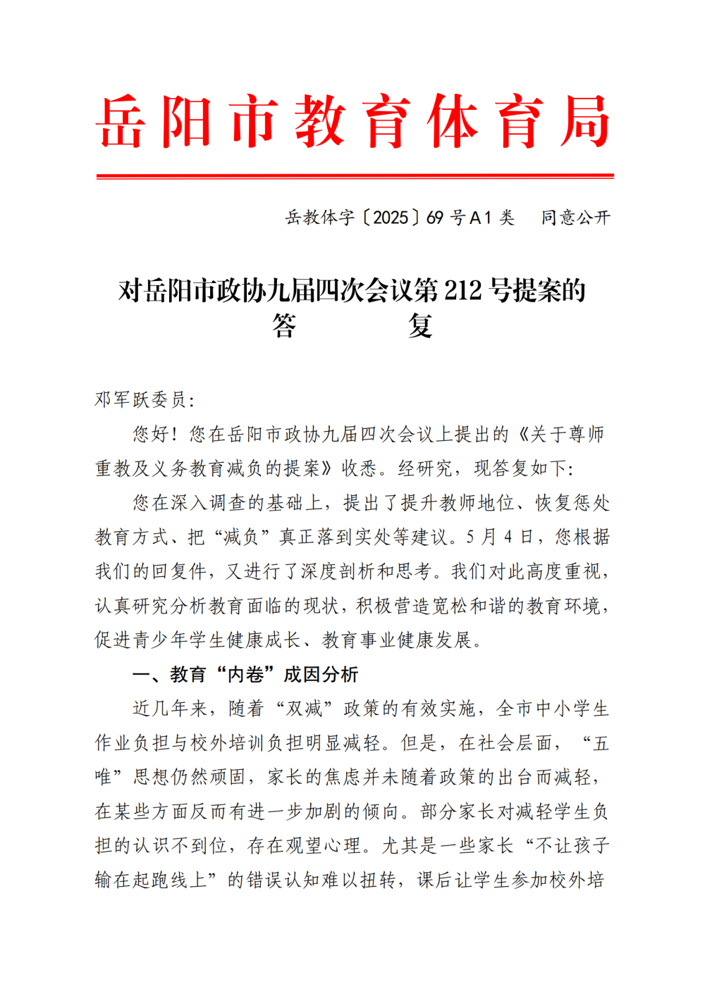 岳教体字〔2025〕69号对岳阳市政协九届四次会议第212号提案的答复
