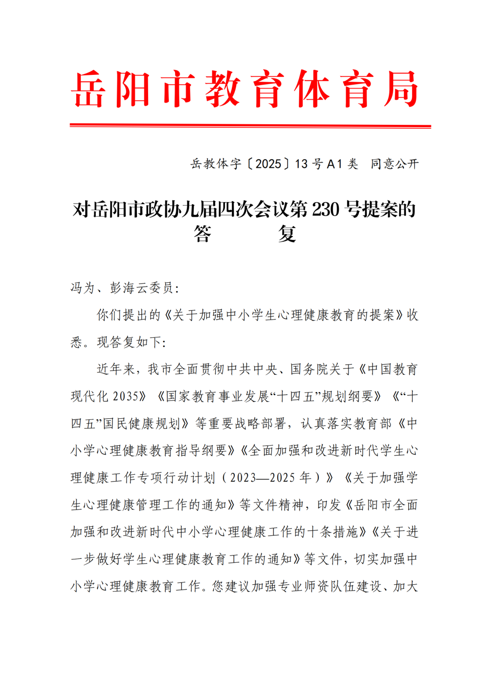 岳教体字〔2025〕13号对岳阳市政协九届四次会议第230号提案的答复