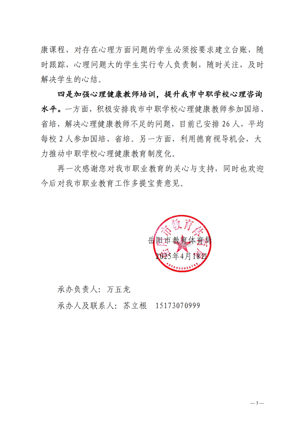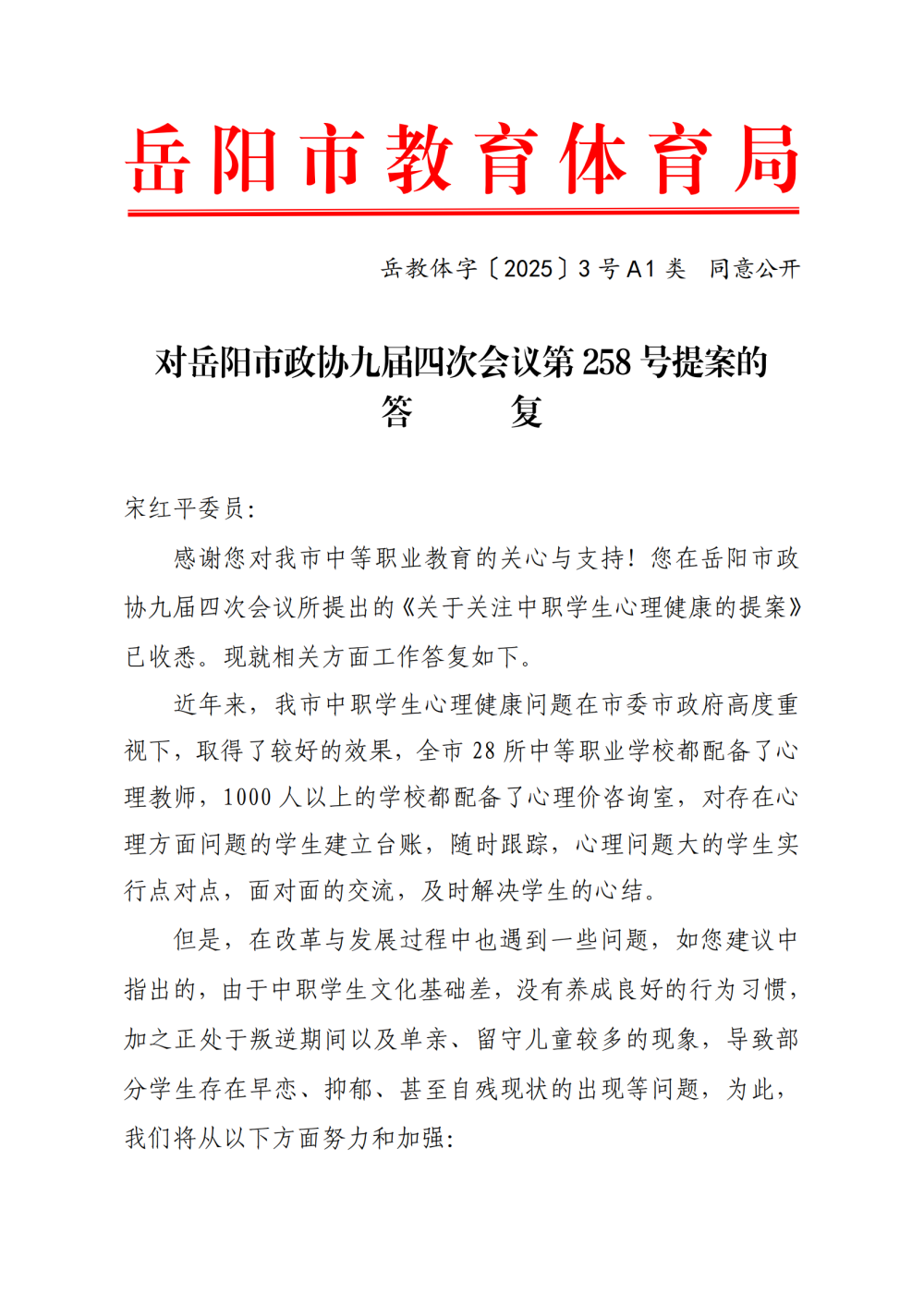 岳教体字〔2025〕3 号对岳阳市政协九届四次会议第258号提案的答复