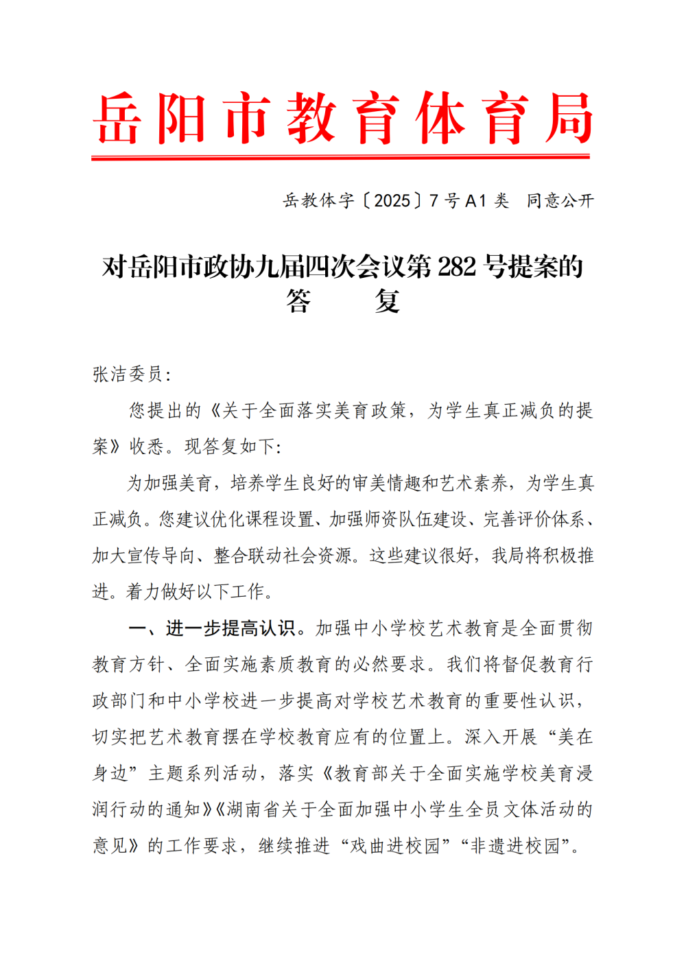 岳教体字〔2025〕7号对岳阳市政协九届四次会议第282号提案的答复