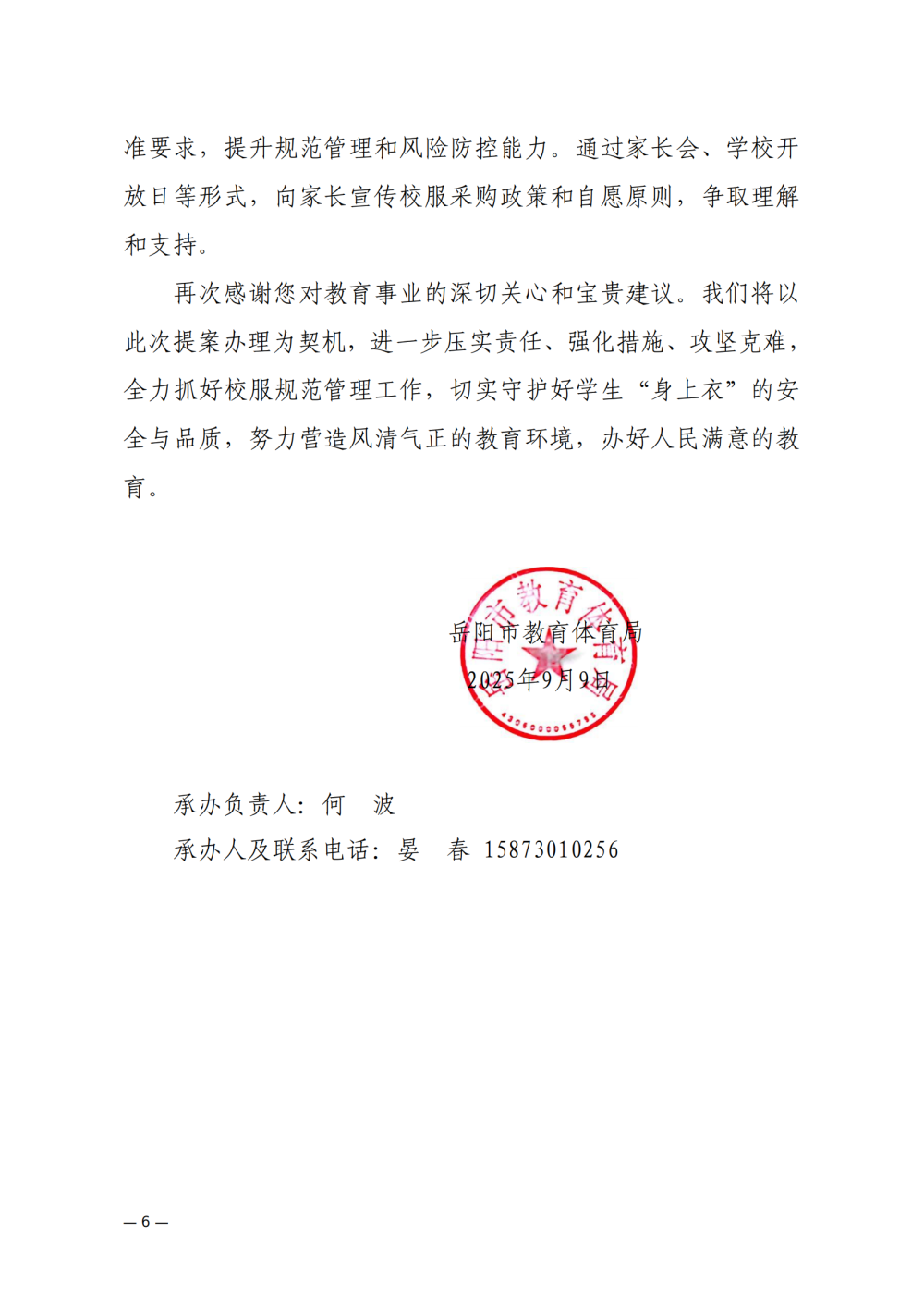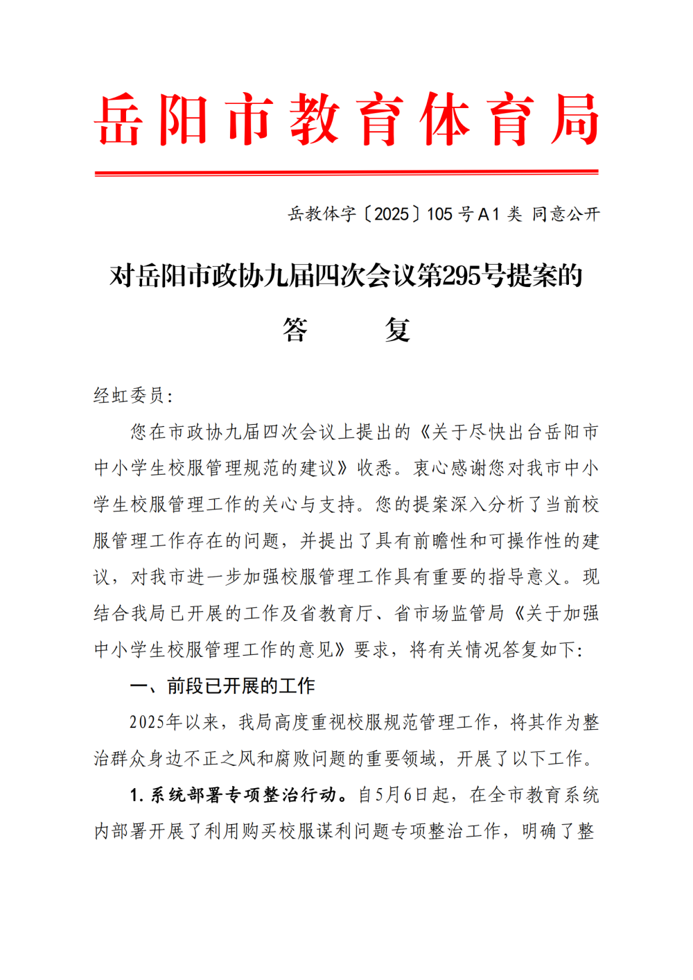 岳教体字〔2025〕105 号对岳阳市政协九届四次会议第295号提案的答复
