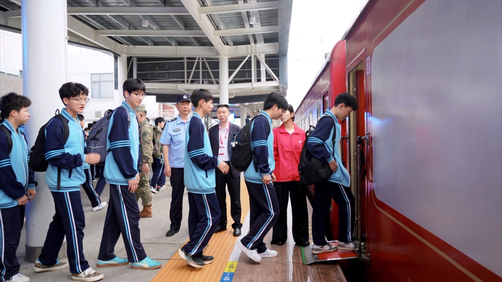 “韶山,是我一直向往的地方。希望能亲身感受‘孩儿立志出乡关’那份跨越时空的豪情与担当。”动员会上,即将出发的学生们流露出满满的期待。动员结束后,县一中、县三中、岳雅高级中学的少年们队列整齐地来到岳阳南站,井然有序地登上红色专列;县二中、县职业中专的学子们则登上研学大巴,出发前往韶山。