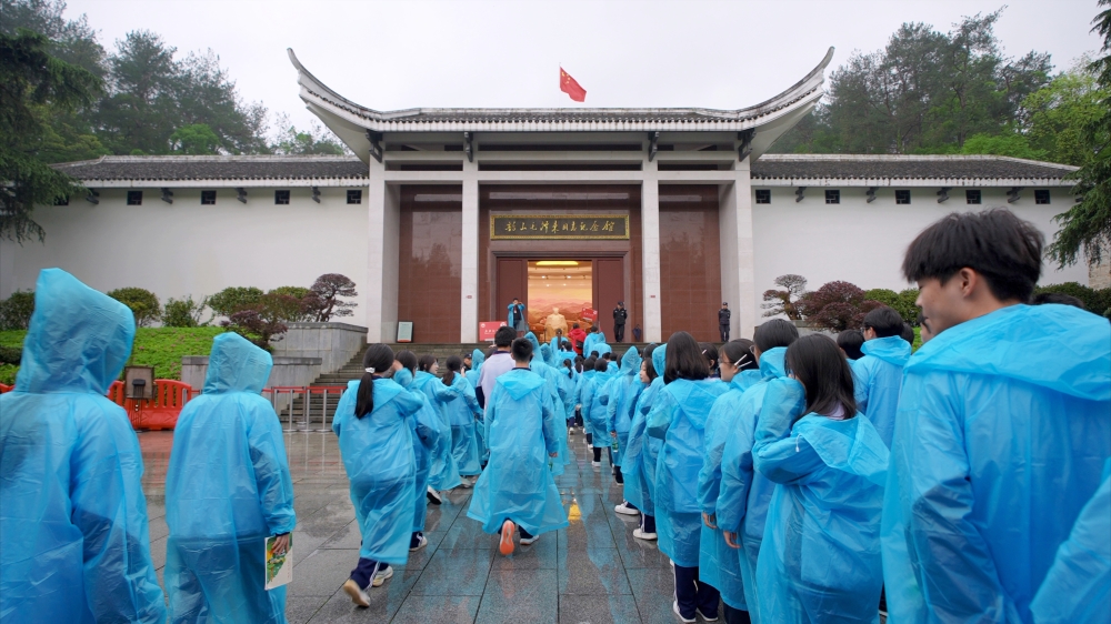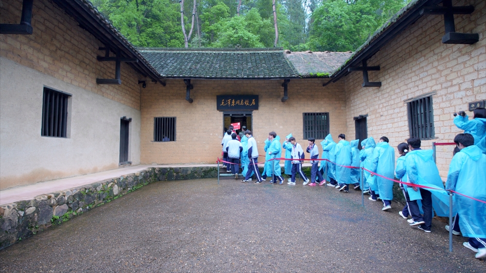 雨滴顺着瓦檐滴落,宛如时光的珠帘,增添了几分历史的厚重感。毛泽东同志故居内,学子们两人并排为列缓步前行,聆听着伟人带领家人参加革命,一心拯救中国的感人故事,真切体会先辈艰苦朴素的作风与胸怀天下的家国情怀。