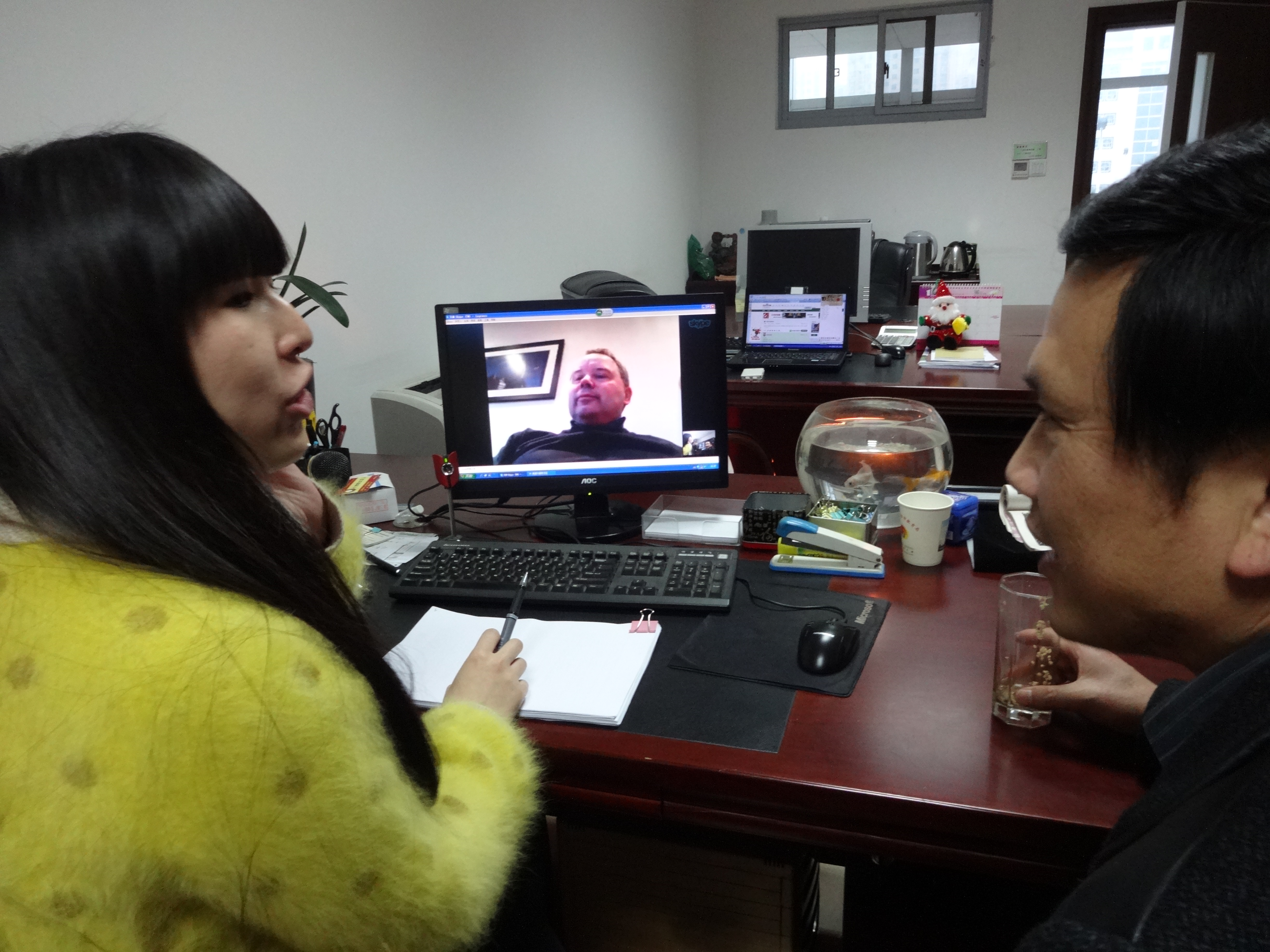图为市教育国际交流中心主任万志勇、翻译李彦青同萨姆赛特郡合作办主任艾俊先生连线视频场景。