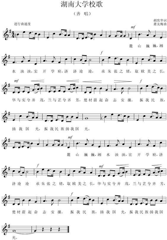 校 歌:麓山巍巍,湘水泱泱。宏开学府,济济跄跄。承朱张之绪,取欧美之长,华与实兮并茂,兰与芷兮齐芳。楚材蔚起,奋志安攘。振我民族,扬我国光。(1933年,由我国著名教育家、湖南大学原校长胡庶华先生作词,著名音乐教育家萧友梅先生作曲)