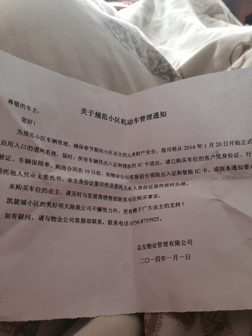 3.关于停车收费问题:因买者少里面停车也不多,平时都不收费。现在在春节临近时突然以一纸通知表示要收取费用,而且该费用是12小时内10元,24小时内是20元,月租金是500元,比沿海发达地区还贵一倍!我现在深圳住的小区月租费才100元,稍微高档的小区业主月租费也就200差不多了。收一定的管理费用无可厚非,但是如此收费是不是直接拒绝没有购买车位的业主停车?询问物业公司他们收费的凭据,他们回答没有物价局的文件!