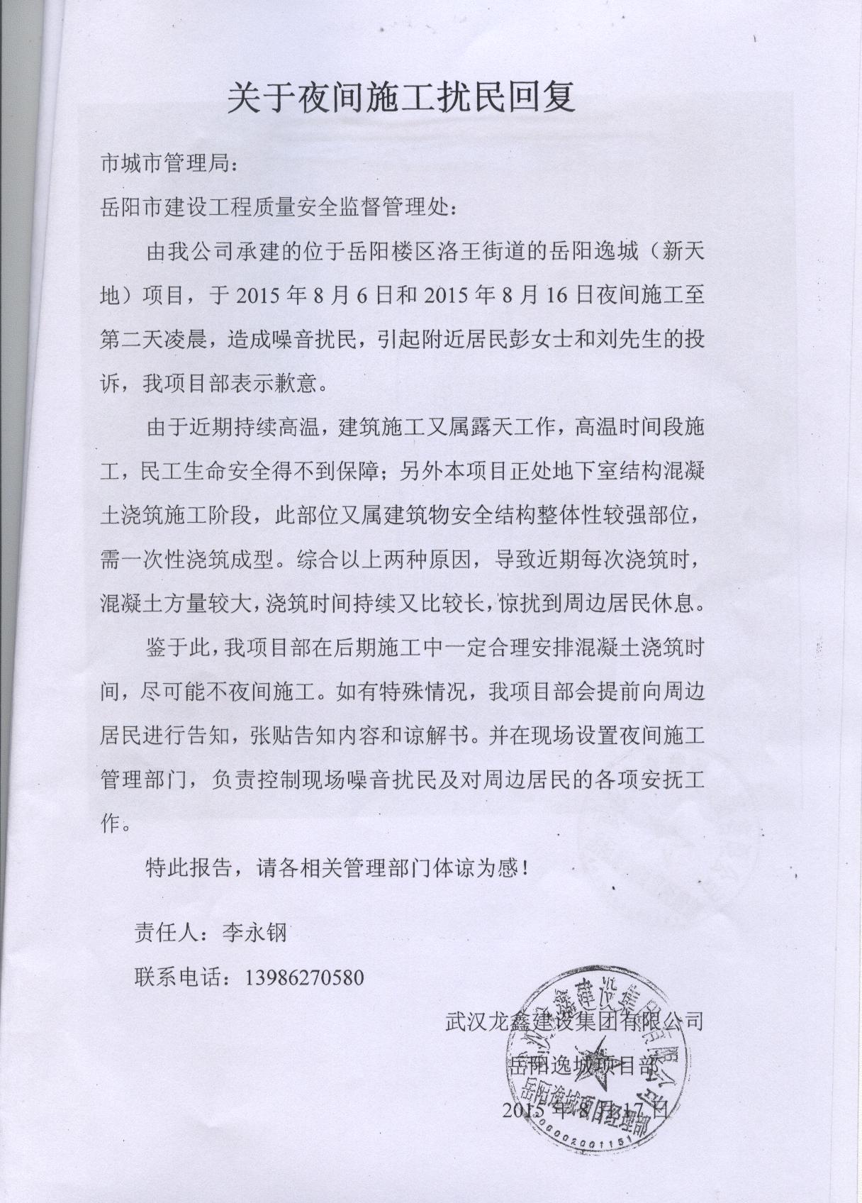 | 回复内容: | 刘女士: 您好!您的来信转至我局,现回复如下: 收到您的投诉后,我局立即安排市建设工程质量安全监督处(以下简称市质安处)进行调查,工作人员与您取得了联系。经调查了解,目前岳阳新天地项目处于地下室顶板混凝土施工阶段,按相关施工技术规范要求,该部位严禁设置混凝土施工缝,需要连续作业,由于近期持续高温,日间可作业时间短,导致项目混凝土浇筑过程中存在夜间施工的情况,确实造成了噪声扰民。 针对以上情况,市质安处已召集岳阳新天地项目的建设、施工、监理方进行约谈,责令该项目的施工企业武汉龙鑫建设有限公司调整作业时间,因工序、工艺要求确需连续作业的,应于施工前到相关部门办理夜间施工许可,并在工地周边醒目位置张挂施工告示,对影响范围内的居民做好沟通解释工作。施工企业也已承诺重新调整作业计划,合理划分施工段,确保后期不在出现夜间施工扰民的问题,市质安处将进一步跟踪该问题的处理情况。若责任单位拒不整改的,我处将建议环保部门依据《中华人民共和国环境噪声污染防治法》的有关要求进行处罚。 特此回复。 岳阳市住房和城乡建设局 2015年8月20日