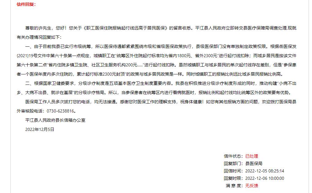 领导您好! 我想咨询一个问题,就是我在岳阳市平江县工作,然后单位购买了职工医保,我今年10月份因急性支气管炎在长沙市岳麓区梅溪湖街道社区卫生服务中心住院治疗(被单位外派到长沙工作期间),费用是1800元左右,我在出院办理医保结算时(先前已办理异地就医备案),被医院告知无法报销。 后来我查询了《平江县医疗保障政策宣传手册》,才得知职工医保在岳阳市外住院起付线为1800元,但是我同时还查询到了,居民医保在省内住院,社区医院起付线都是200元。 所以我就很是纳闷,为什么职工医保的报销待遇远不如居民医保? 是不愿意我们去岳阳市之外的医疗机构吗?为什么居民医保在省内的社区医院住院都是200元起报,而职工医保交着更多的钱却待遇更差?出了岳阳市就执行更高的起付线? 希望能有个合理解释。 真的感觉医保和白买一样,省内异地都那么难使用,我来不如每年300多买居民医保? 之前我在平江县政府官网留言进行了咨询,反馈说“目前我县已实行市级统筹,所以医保待遇都紧紧围绕市级和省级医保政策执行,县级医保部门没有单独制定政策权限”。 所以只能来咨询岳阳市医保局官网这边继续留言咨询,麻烦解释一下?就是真的能不能优化下政策之类的,有个紧急情况什么的也不能坐个车回岳阳住院啊,肯定是就近解决啊? 附件1:1.jpg 附件2:2.jpg 附件3:3.jpg 附件4:4.png 附件5:5.jpg |