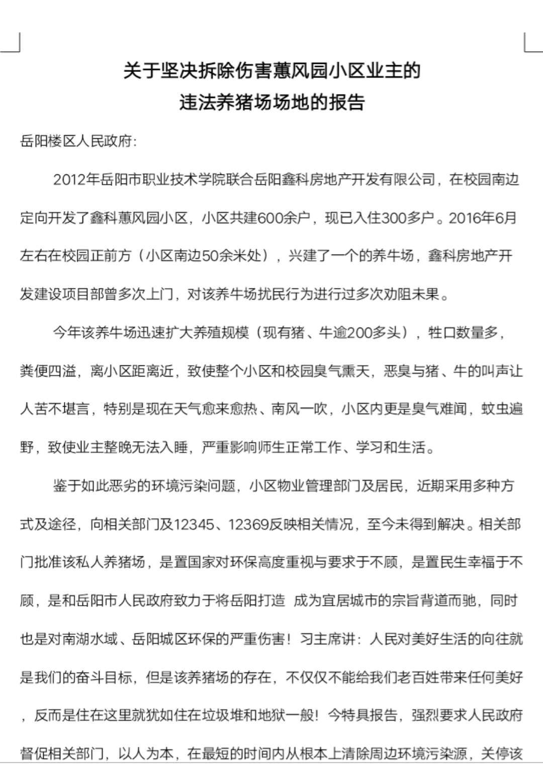 本人是岳阳职院鑫科惠风园的一名普通业主,在鑫科惠风园小区附近直线距离不足100米的地方,有一个养殖场,有养殖猪牛200余头,而猪牛养殖场散发的恶臭味严重影响到小区居民的正常生活,居民、物业多次拨打12345和12369热线进行投诉,但一直毫无改变,该养殖建成于2016年,而小区一期建设竣工时间为2014年,目前该养殖场产生了大量粪便,畜禽粪便中含有大量氮、磷和有机污染物等造成周边区域严重的水质污染,污水对周边居民生活带来极大影响,同时,畜禽粪便经过发酵后会产生大量的氨氮、硫化氢、粪臭素、甲烷等有害气体,不但会破坏生态,还会直接影响人类健康,为此,本人特向相关职能部门做如下请求: