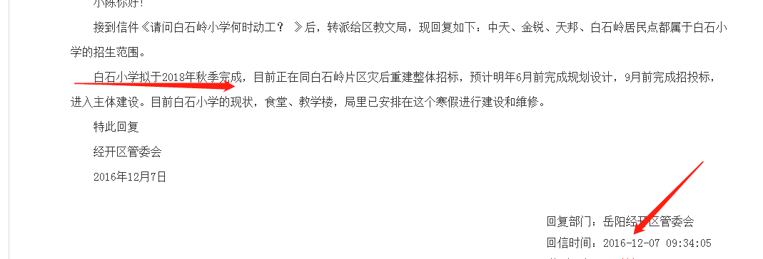 关于市民小陈来电反映白石小学扩建时间的问题,现说明如下:白石小学建设早在2016年就已纳入市重点建设项目“六建六扩”工程,我局也完成了学校原址扩建前期建设的所有报建报批工作。但由于原址地势低洼,工委、管委会领导率各职能部门现场察看后将原址扩建改为择址重建并纳入白石棚改范围。目前白石棚改大规划正在调整之中,所以我局无法确定其建设位置。预计2018年完成学校的规划设计,2019年启动该校建设。