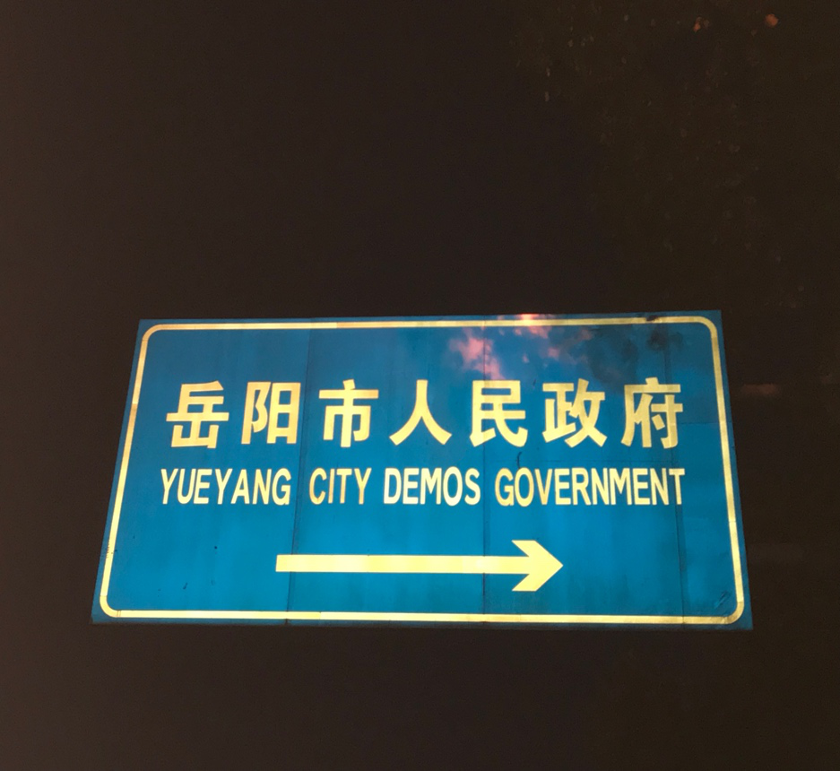 岳阳市人民政府正门口的路牌,译为Yueyang city Demos Government,其中demos发源于古希腊,偏向于信奉民主的公民政体,用在中国并不合适,在政治上会造成不必要的麻烦。