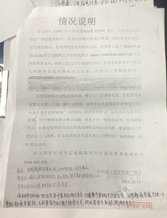 经查实,投诉人张文超系平江县加义镇献钟街道居民,该人于今年7月29日在苏宁易购网上下单购买了一台海尔全自动波轮洗衣机,购机门店为苏宁易购长沙站,送货地址为平江县加义镇献钟街道兴隆水暖五金店。现该同志提出的开具发票、道歉等事宜,与苏宁汨罗财富广场店无关,我局无法处理。