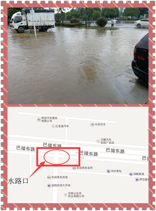 经查,八字门汇丰家居段由于主涵堵塞,积水不能正常排入主涵,导致大雨时该地段积水严重。经开区城管部门对此实施了顶管工程,但在施工过程中引起巴陵东路原排水管出水口无法排入新路主涵,故此处积水现象仍然存在。为彻底解决该段积水问题,需将巴陵东路排水管接入新建排水主涵,由于重新铺设该段排水管(约20m,DN800玻纹管)所需经费较大,已超出市政正常维护范围,现已向申报了改造计划,积极争取改造经费,待改造经费落实后,将在最快的时间内组织施工,解决该处积水问题。