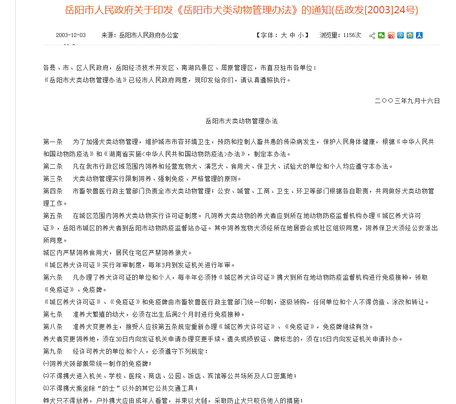 标题: 关于《岳阳市犬类动物管理办法》的通知(岳政发[2003]24号)的更新和建议
