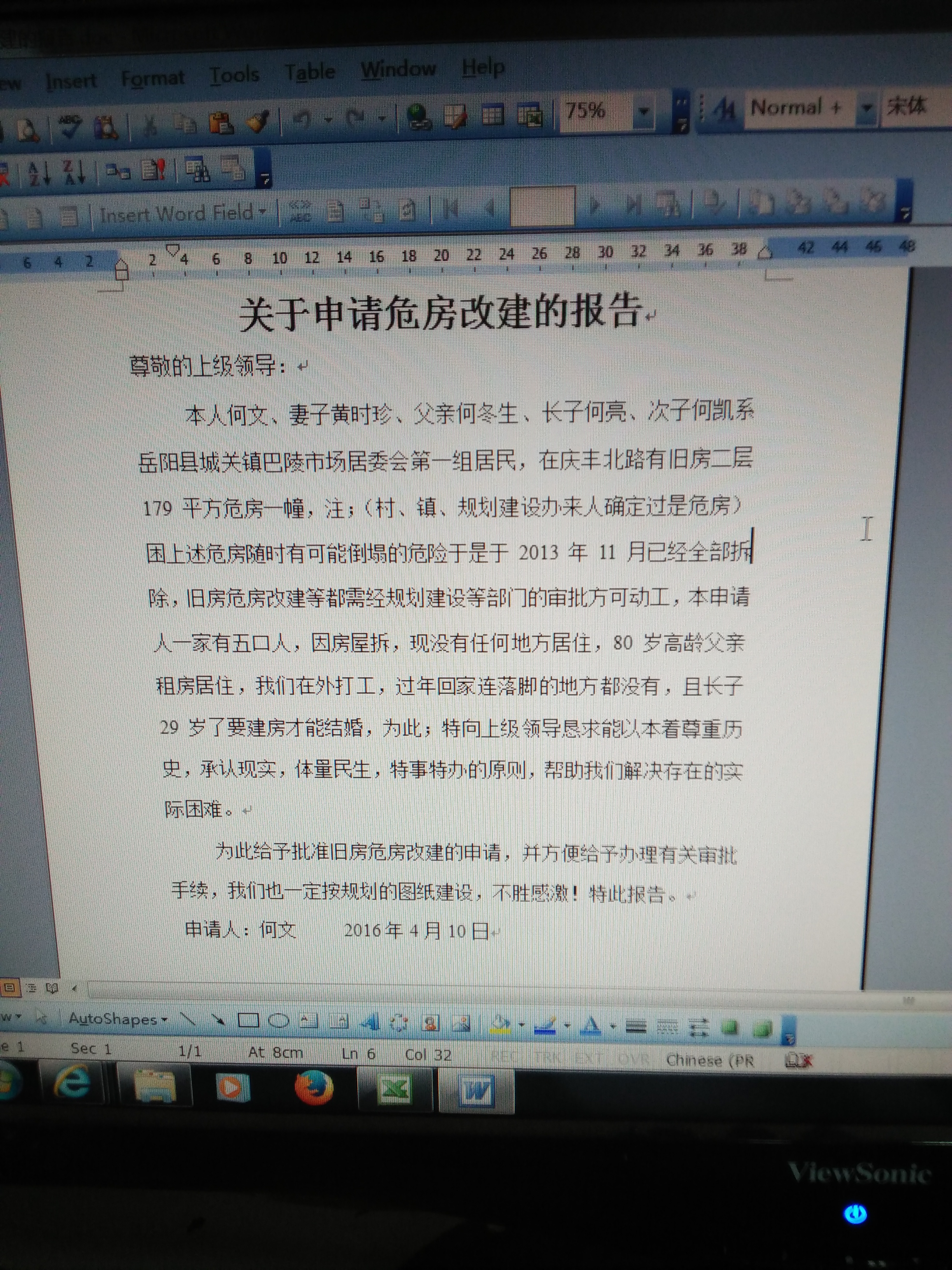 本人何文、妻子黄时珍、父亲何冬生、长子何亮、次子何凯系岳阳县城关镇巴陵市场居委会第一组居民,在庆丰北路有旧房二层179平方危房一幢,注;(村、镇、规划建设办来人确定过是危房)困上述危房随时有可能倒塌的危险于是于2013年11月已经全部拆除,旧房危房改建等都需经规划建设等部门的审批方可动工,本申请人一家有五口人,因房屋拆,现没有任何地方居住,80岁高龄父亲租房居住,我们在外打工,过年回家连落脚的地方都没有,且长子29岁了要建房才能结婚,为此;特向上级领导恳求能以本着尊重历史,承认现实,体量民生,特事特办的原则,帮助我们解决存在的实际困难。