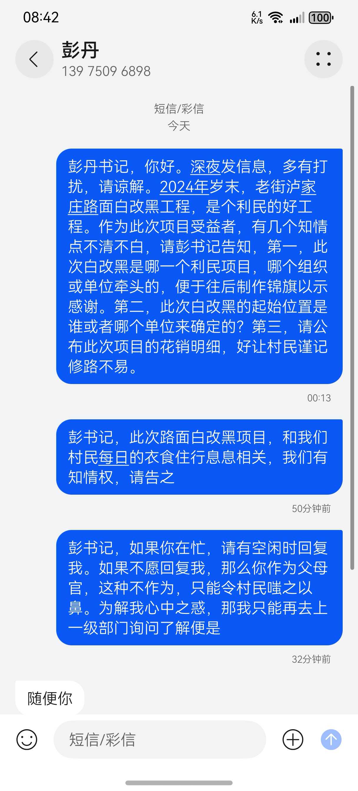 上级领导,你们好! 2024年年底,新墙镇新墙居委会泸家庄部分道路白改黑项目,本村民有疑问时,村部书记不解释,村务不公开不透明,疑为暗箱操作之嫌, 请上一级领导进行问询,答复我! 谢谢! |