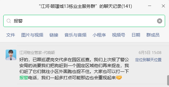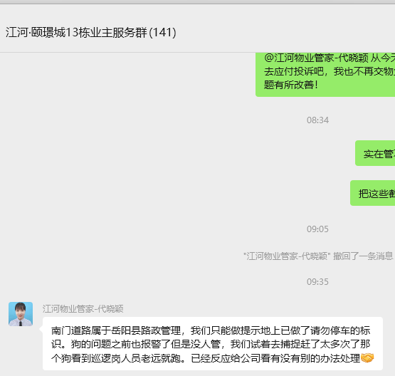 岳阳县雅礼学校对面的江河颐璟城小区内,流浪狗、不牵绳狗已泛滥成灾,严重影响到居民的正常生活秩序和生活安全,向物业公司多次反馈无果,物业表示也已多次报警,然公安部门一直不予作为!!!! 附件1:微信图片_20251104174407_610_95.jpg 附件2:微信图片_20251105082814_612_95.jpg |